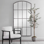 Contemporary And French Country Styles Merge In This Arched Mirror. Reminiscent Of A Large Window, This Piece Features A Hand Forged Iron Construction With An Aged Rust Gray Finish That Has Been Distressed And Covered In An Off-white Wash.
