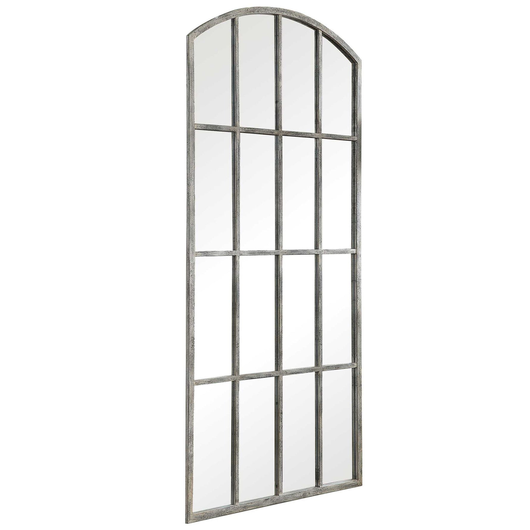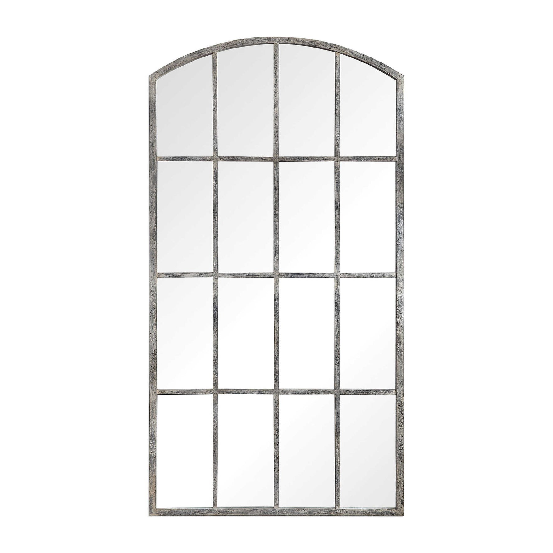 - Contemporary And French Country Styles Merge In This Arched Mirror. Reminiscent Of A Large Window, This Piece Features A Hand Forged Iron Construction With An Aged Rust Gray Finish That Has Been Distressed And Covered In An Off White Wash.