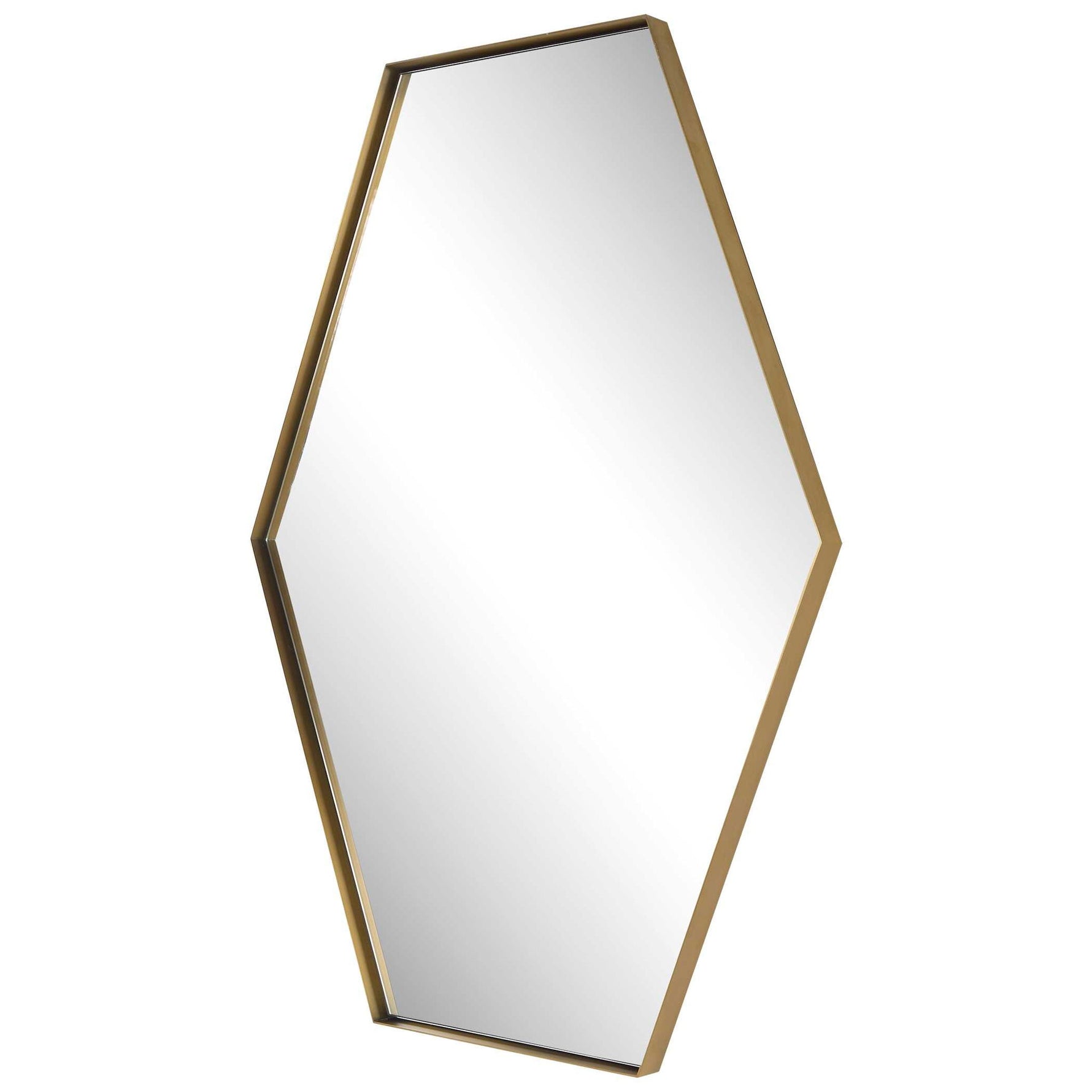 - This Hexagon Mirror Features A Contemporary Style Using A Stainless Steel Frame Finished In A Plated Brushed Brass, Surrounding A Floating Style Polished Edge Mirror. May Be Hung Horizontal Or Vertical.