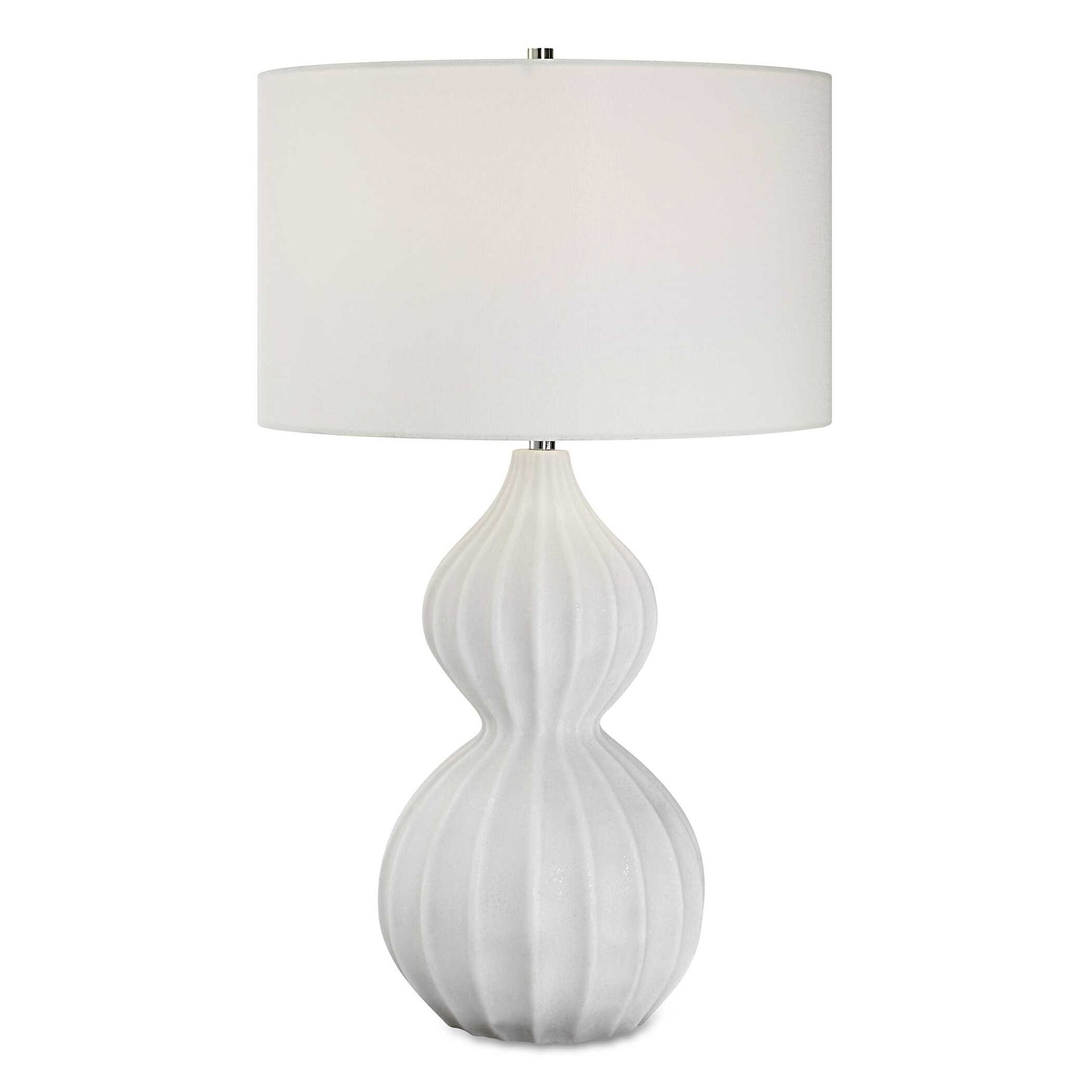 - This Table Lamp Is Executed In A Rich Ivory Man-made Stone That Accurately Replicates The Look Of Thasos Marble Featuring Scalloped Ridges And Polished Nickel Accents.