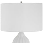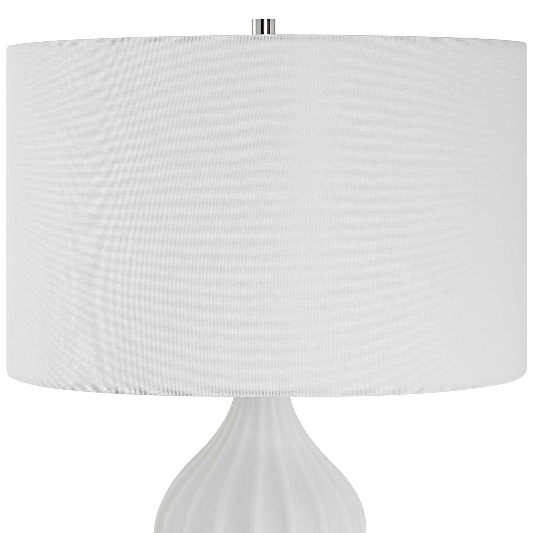 This Table Lamp Is Executed In A Rich Ivory Man-made Stone That Accurately Replicates The Look Of Thasos Marble Featuring Scalloped Ridges And Polished Nickel Accents. The Round Hardback Shade Is Covered In A White Linen Fabric.