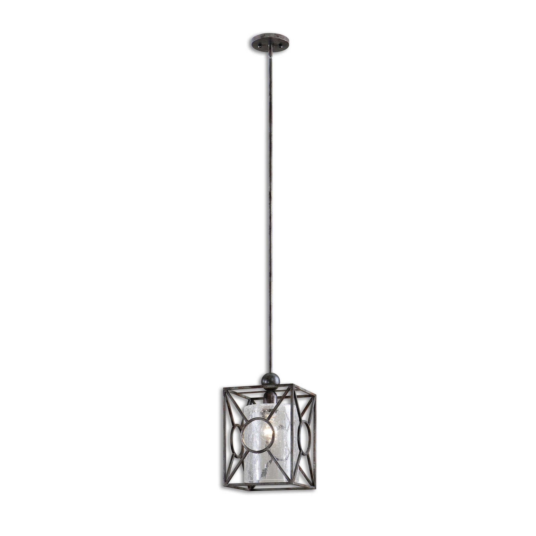 Rust Black Finish With Aged Gray Undertones And A Crackled Glass Cylinder Inner Shade. 1-60 Watt Max, Edison Socket. Bulb Not Included. Supplied With 15' Wire, 3-12" Stems And 1-6" Stem For Adjustable Installation.
