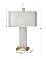 White Alabaster Base Accented With Plated Coffee Bronze Details. The Double Shade Is A Sheer Outer Hardback With A White Linen Inner Hardback.