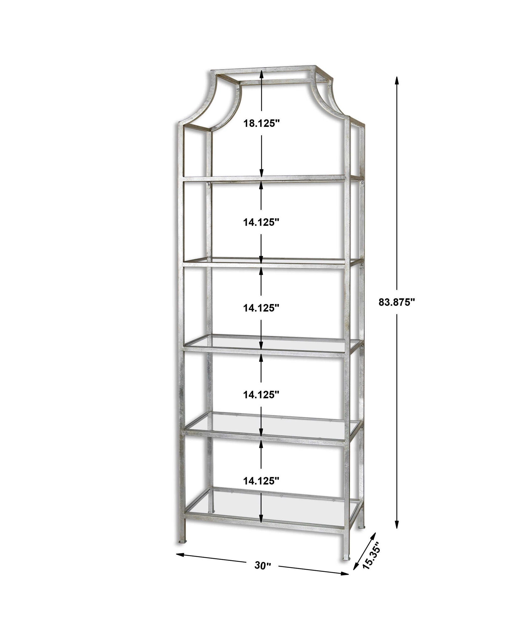 • Transitional In Style, This Forged Iron Etagere Features A Bright Silver Leaf Finish With Five Tempered Glass Shelves.