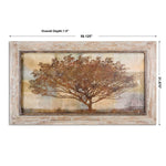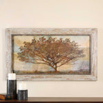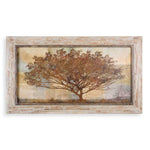 Reminiscent Of The African Marula Tree, This Oil Reproduction Features A Hand Applied Brushstroke Finish. Light Gray And Slate Blue Shades Are Highlighted By Various Sepia Tones In This Landscape Artwork. The Frame Resembles Reclaimed Wood, With Light Wood Undertones, A Pale Blue-gray And Taupe Paint, And An All-over Gray Wash. The Inner Lip Is Raised And Has A Distressed, Dark Brown Wood Undertone. Artwork By Mark Chandon.