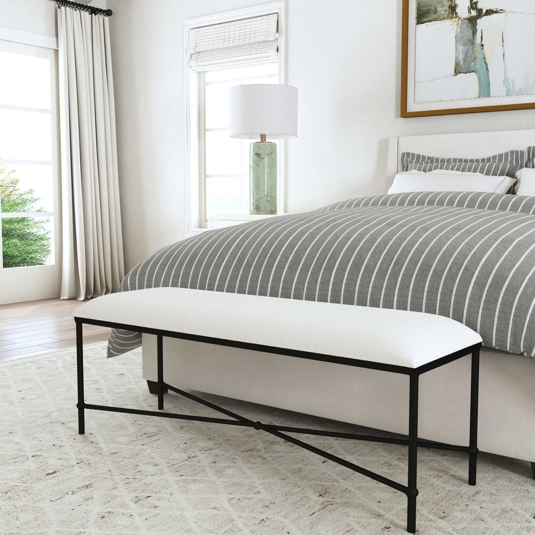 - Thoroughly Modern Yet Inspired By The Classics, This Bench Displays A Stylish Black And White Look Featuring An Iron Frame In Aged Black, Upholstered In A Crisp White Textured Fabric.
