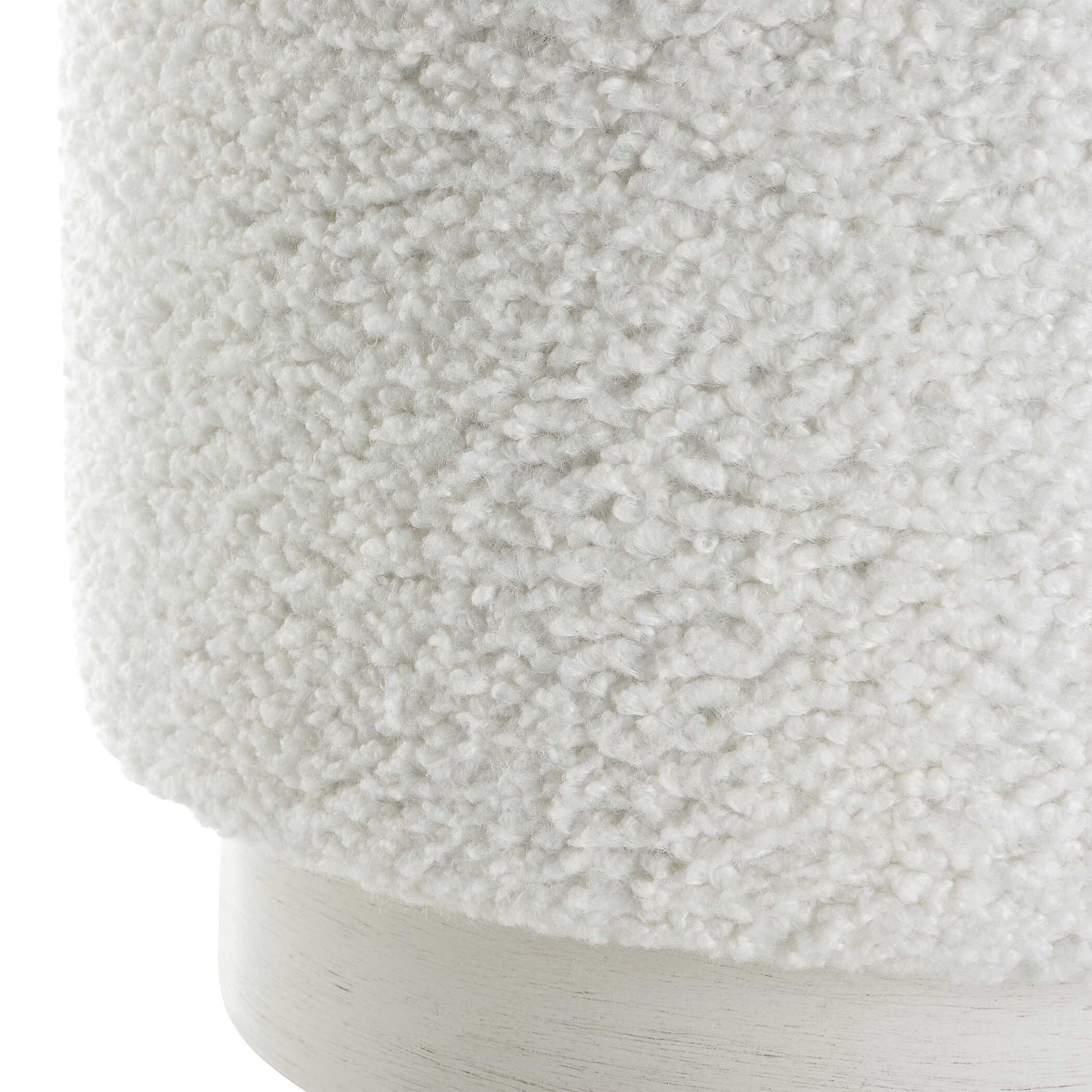 - This Plush Ottoman Is Covered In White Faux Shearling Paired With A Wire Brushed Oak Base In A Modern White Finish. Versatile And Stylish, This Piece Can Be Used As A Seat Or Footrest, Grouped Together Or As A Singular Accent Piece.