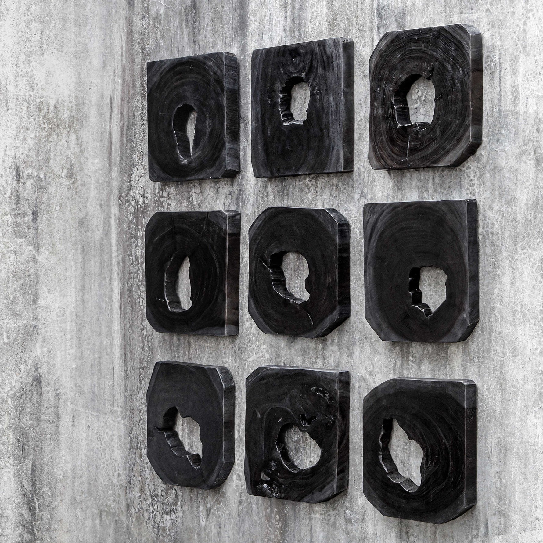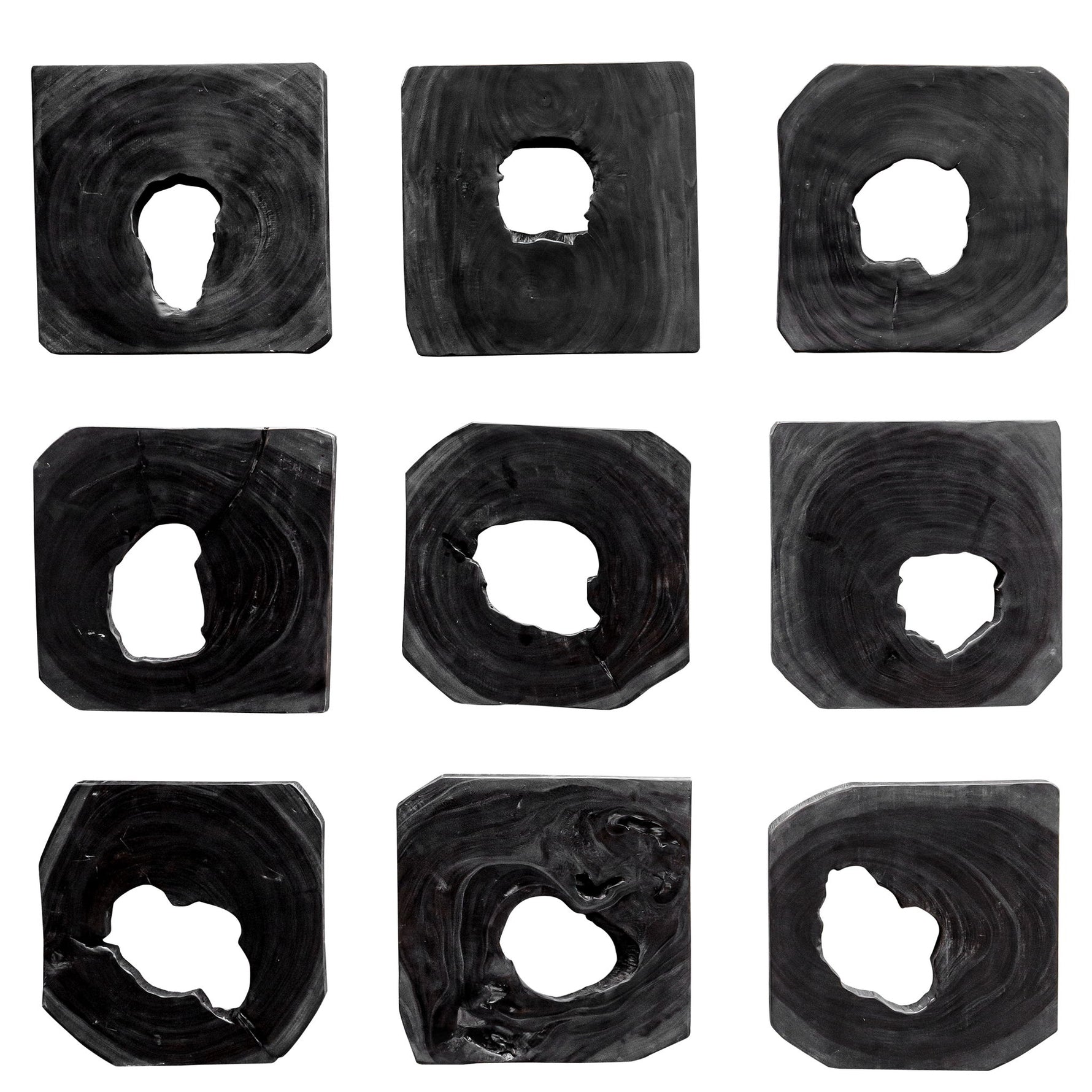 This Set Of 9 Wood Wall Art Features Cross Sections Of Solid Natural Suar Wood Finished In A Smooth Ebony Stain. Because Each Is Individually Handcrafted, Natural Variation Will Occur From Piece To Piece.