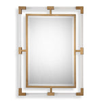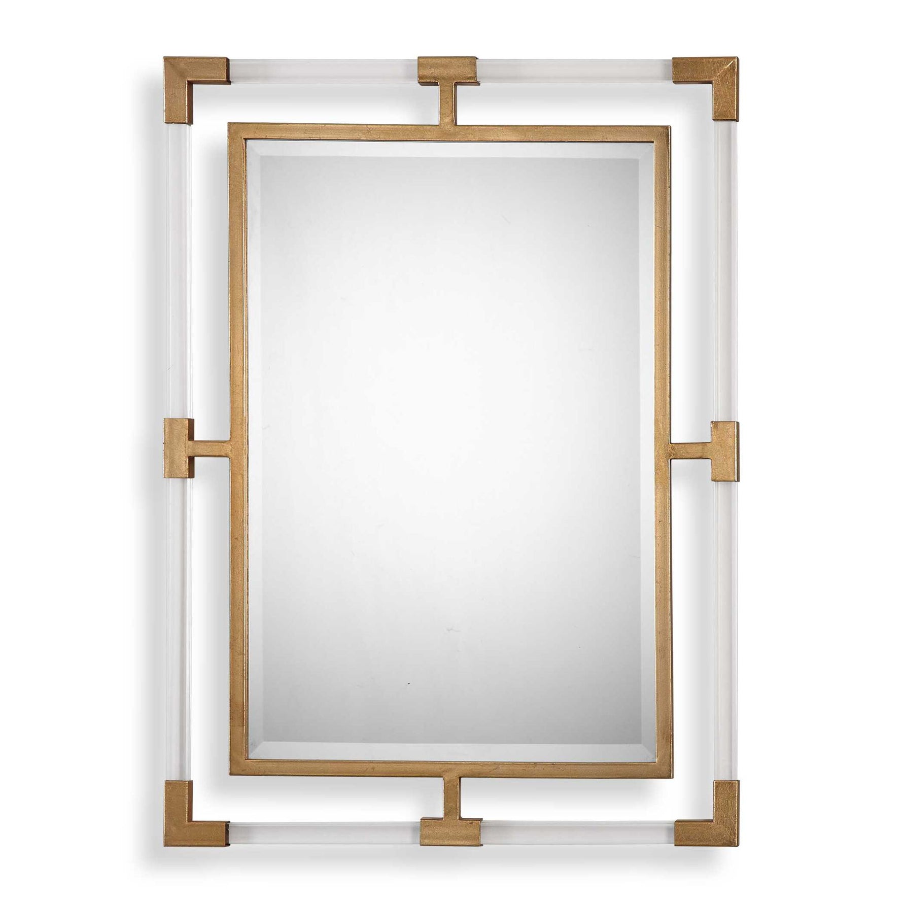 This Mirror Can Certainly Serve As A Focal Point For Any Room. Combining Forged Iron Finished In A Metallic Gold Leaf With Suspended, Clear Acrylic Solid Bars Creating A Modern Feel. Mirror Has A Generous 1 1/4" Bevel And May Be Hung Horizontal Or Vertical.