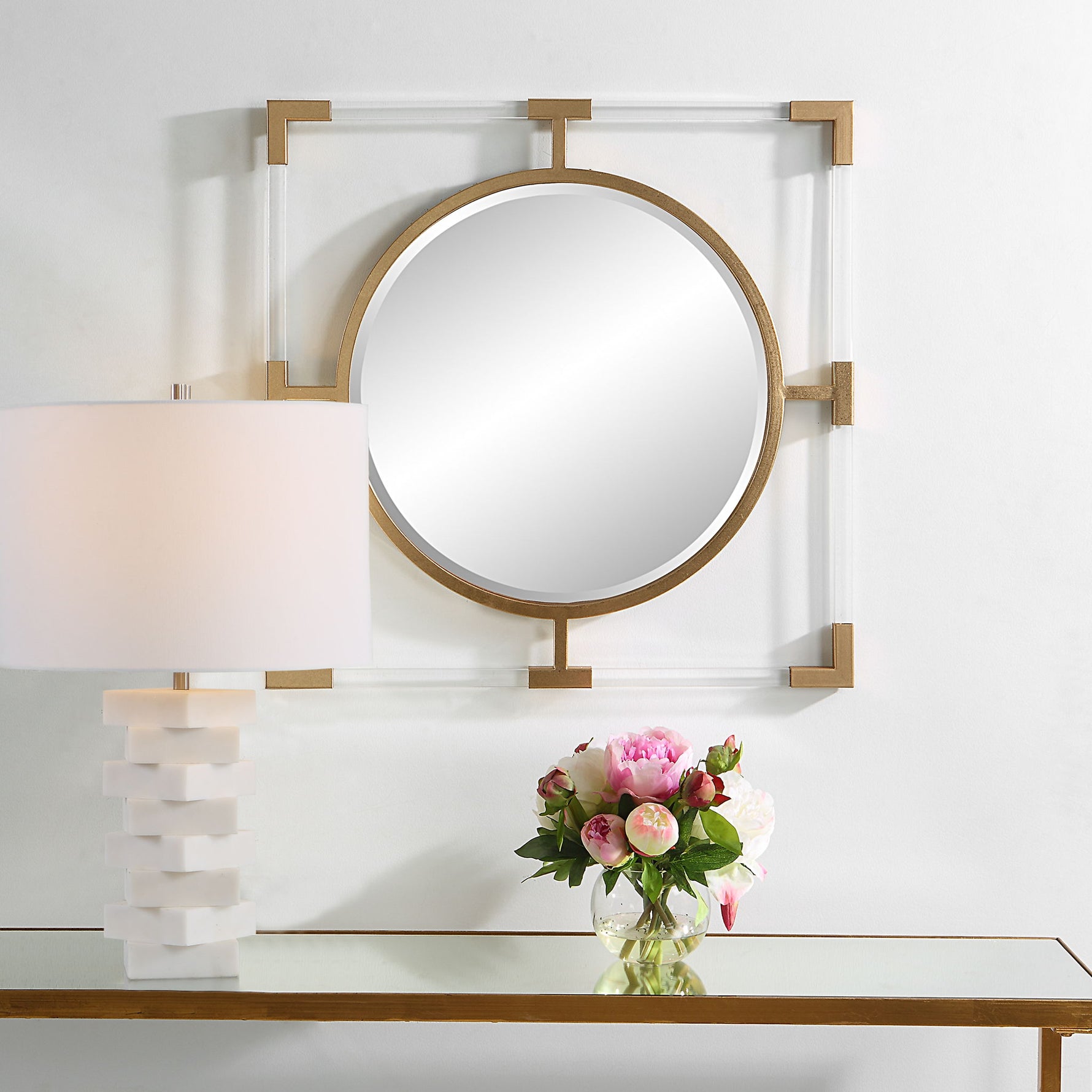 The Balkan Small Mirror Looks Great Alone Or Paired With Multiple For A Stunning Display. The Forged Iron Frame Is Finished In A Metallic Gold Leaf, With Suspended, Clear Acrylic, Solid Bars Creating A Modern Feel. Mirror Has A 1" Bevel.