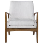 Scandinavian Style Accent Chair Featuring An Exposed Solid Wood Frame Finished In A Honey Stain And Covered In A Subtle, Taupe And White Chevron Polyester Performance Fabric.