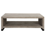 This Casual Coffee Table Provides Ample Display Space And Creates A Rustic Feel With Its Natural Wood Finish And Intricate Carved Details, Highlighted By A White Washed Glaze. Steel Feet Are Finished In A Natural Aged Black.