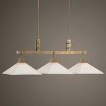 Enriched Industrial Style With A Hint Of Craftsman Lines Bring Together This Elegant Linear Chandelier Enhanced With An Aged Brass Finish And Etched, White Frosted Glass Shades. 3-100 Watt Max, Edison Sockets. Bulbs Not Included. Supplied With 20' Wire, 6-12" Stems And 2-6" Stems For Adjustable Installation.