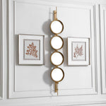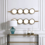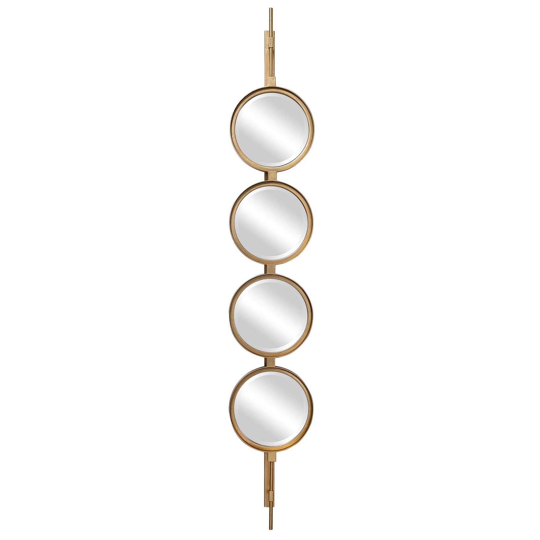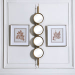 Contemporary In Style, This Mirror Features A Sleek Iron Base With Linear Metal Accents. The Piece Is Finished In Gold Leaf With Four Round Beveled Mirrors. Group Multiple Pieces Together And Hang Horizontal Or Vertical To Create A Truly Unique Wall Feature.
