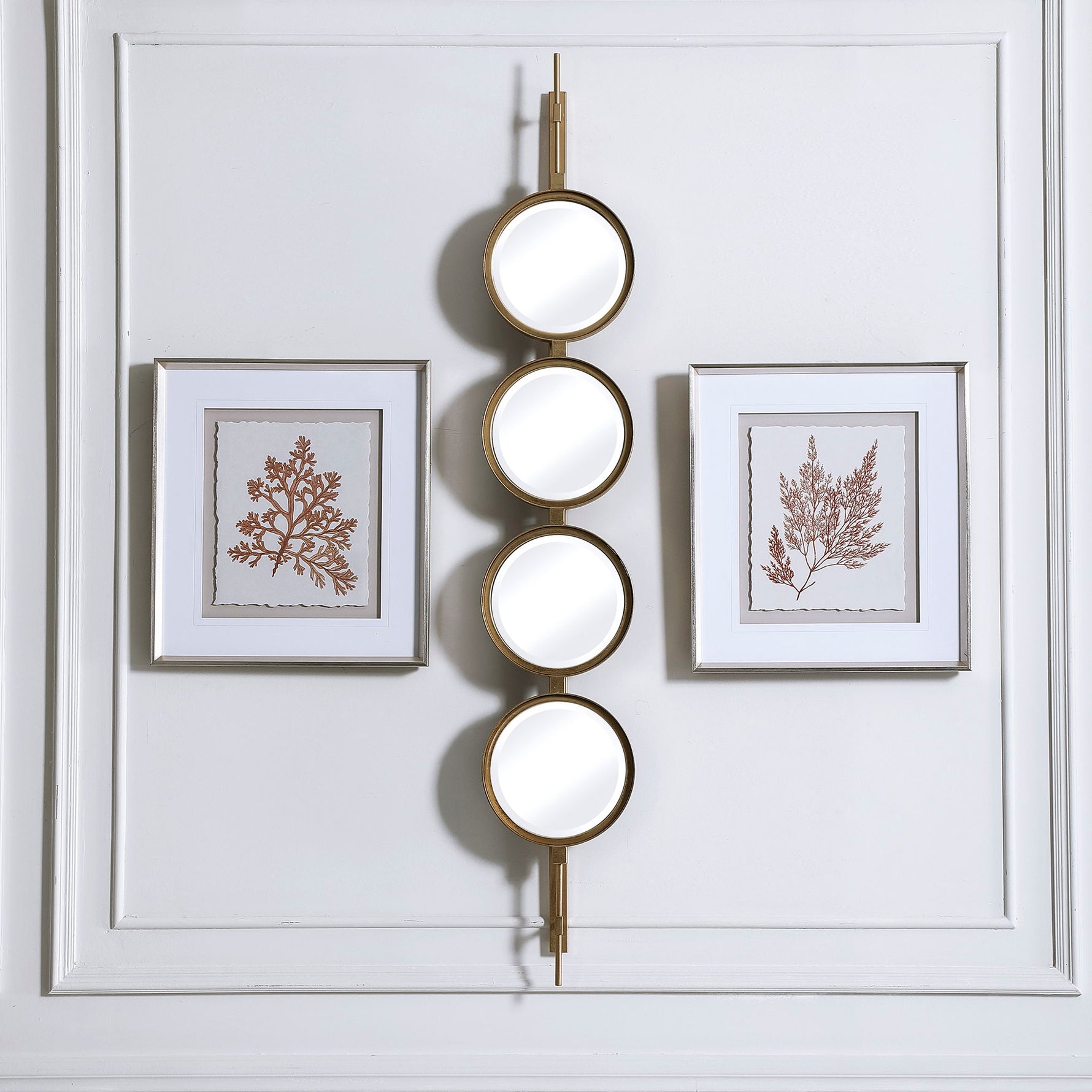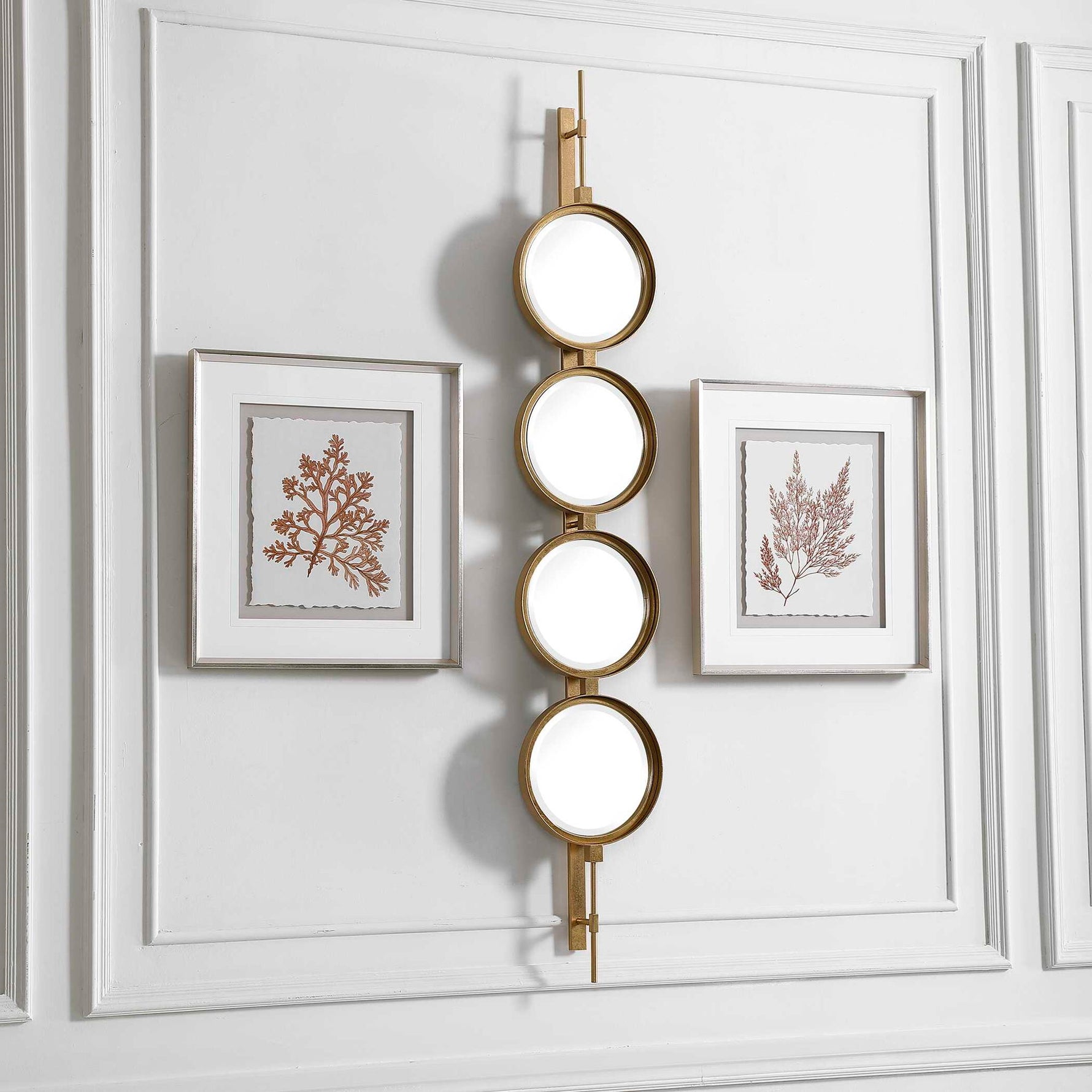 • Contemporary In Style, This Mirror Features A Sleek Iron Base With Linear Metal Accents. The Piece Is Finished In Gold Leaf With Four Round Beveled Mirrors. Group Multiple Pieces Together And Hang Horizontal Or Vertical To Create A Truly Unique Wall Feature.