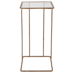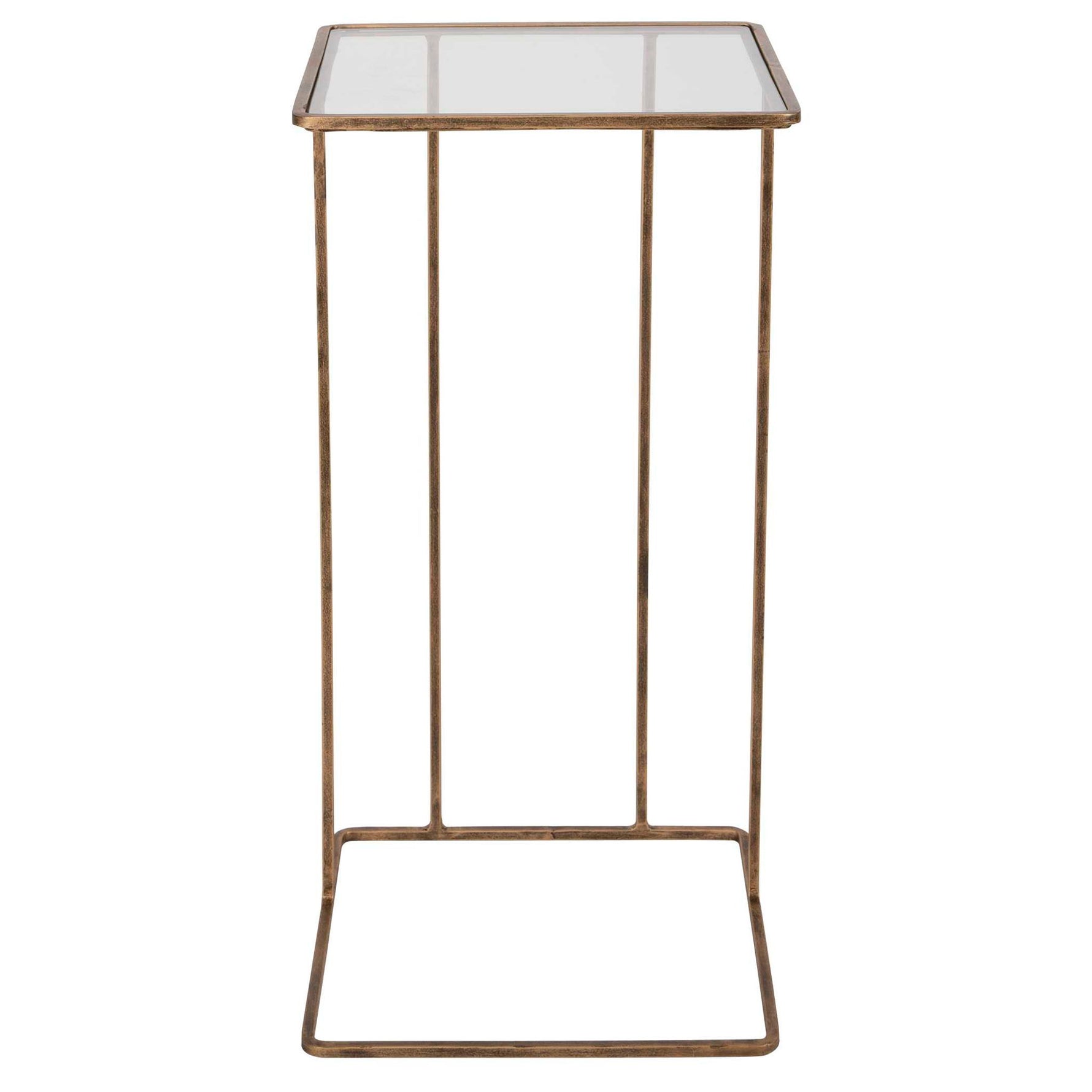 Minimally Designed With Versatility, This Petite Hand Forged Iron Accent Table Is Finished In Heavily Antiqued Gold With A Clear Tempered Glass Top.