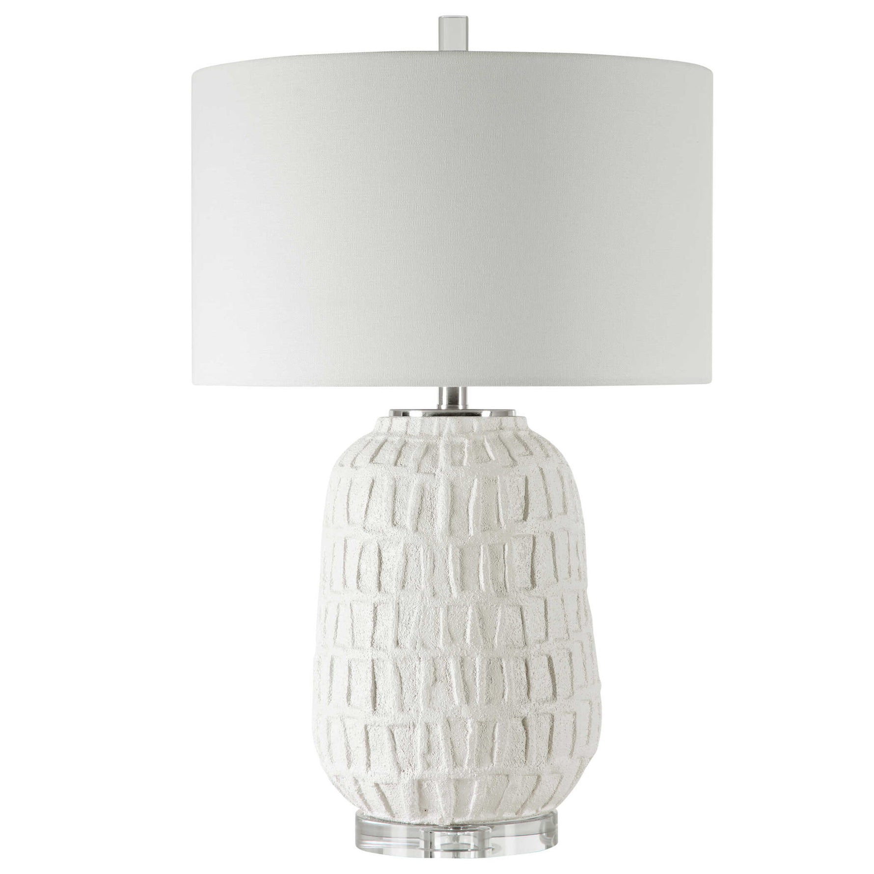 A Modern Take On Old World Style, This Table Lamp Features A Textured, Aged White Ceramic Base With An Organic Grid Design Displayed On A Thick Crystal Foot With Polished Nickel Accents. The Lamp Is Paired With A White Linen Drum Shade.