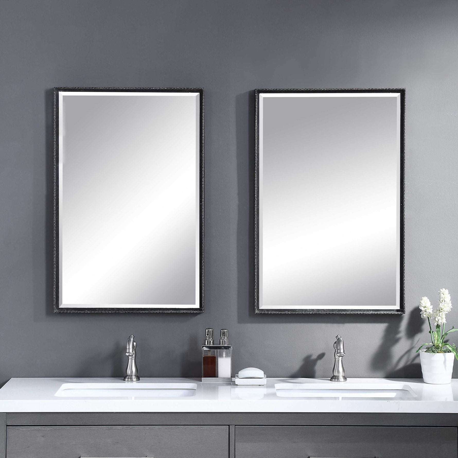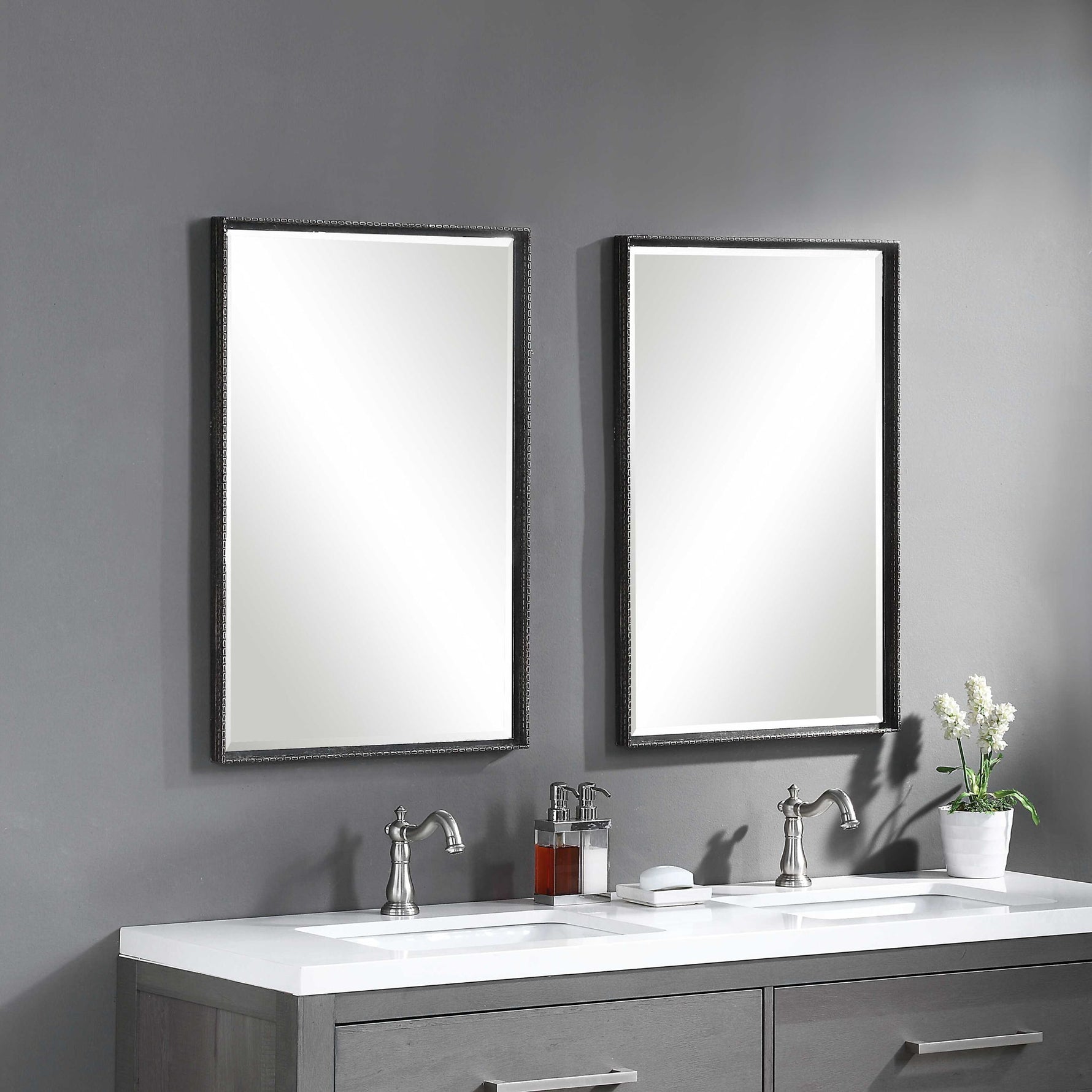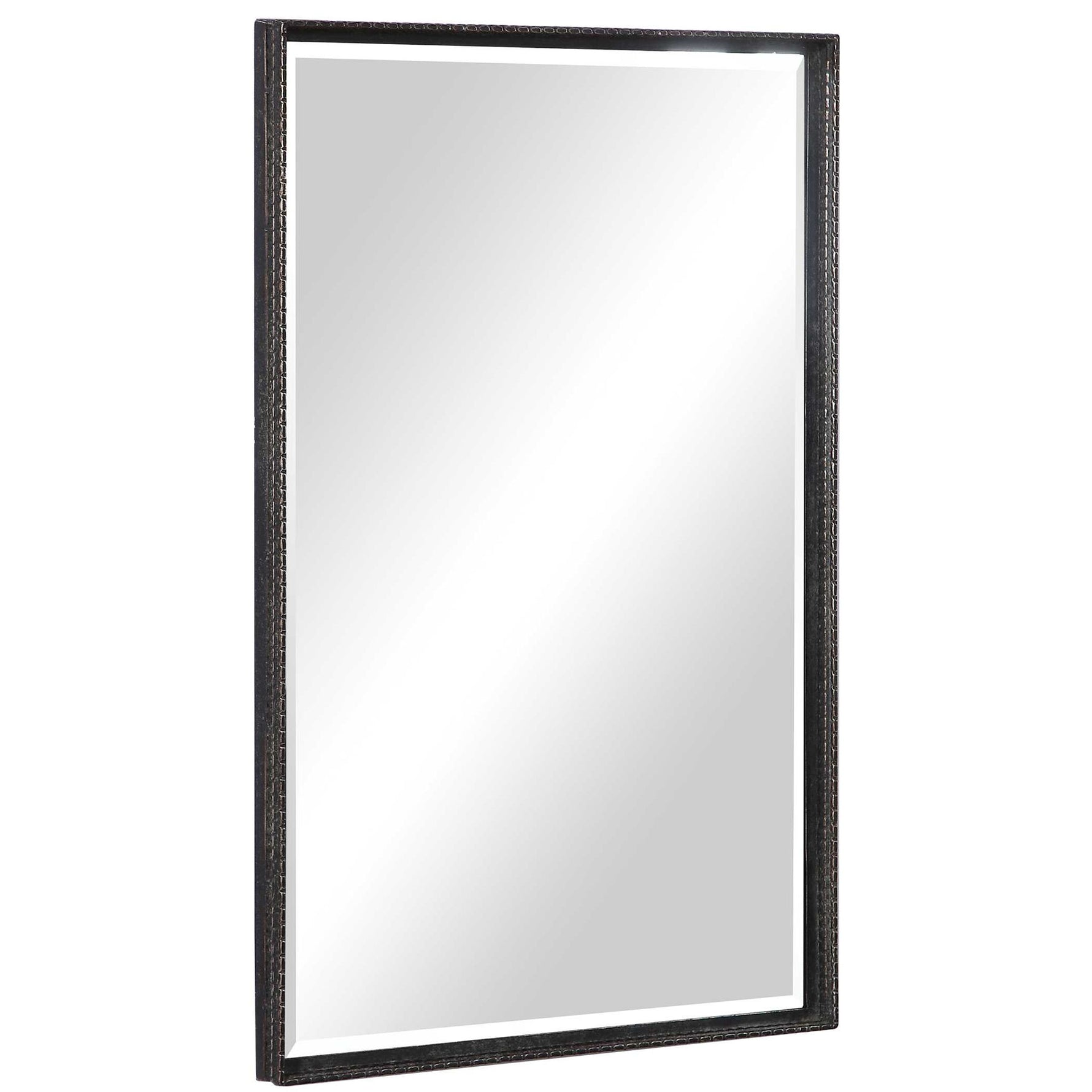 - This Simple Vanity Mirror Features An Iron Construction With Detailed Edges. The Slight Profile Frame Is Finished In A Distressed Rustic Black With Aged Champagne Highlights. This Mirror May Be Hung Horizontal Or Vertical.