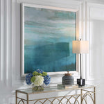 Inspired By The Beautiful Teal Waters Of Cancun, This Abstract Artwork Packs A Colorful Punch. The Print Is Accented By A Chamfered Edge White Wooden Frame. Artwork By Santiago.