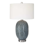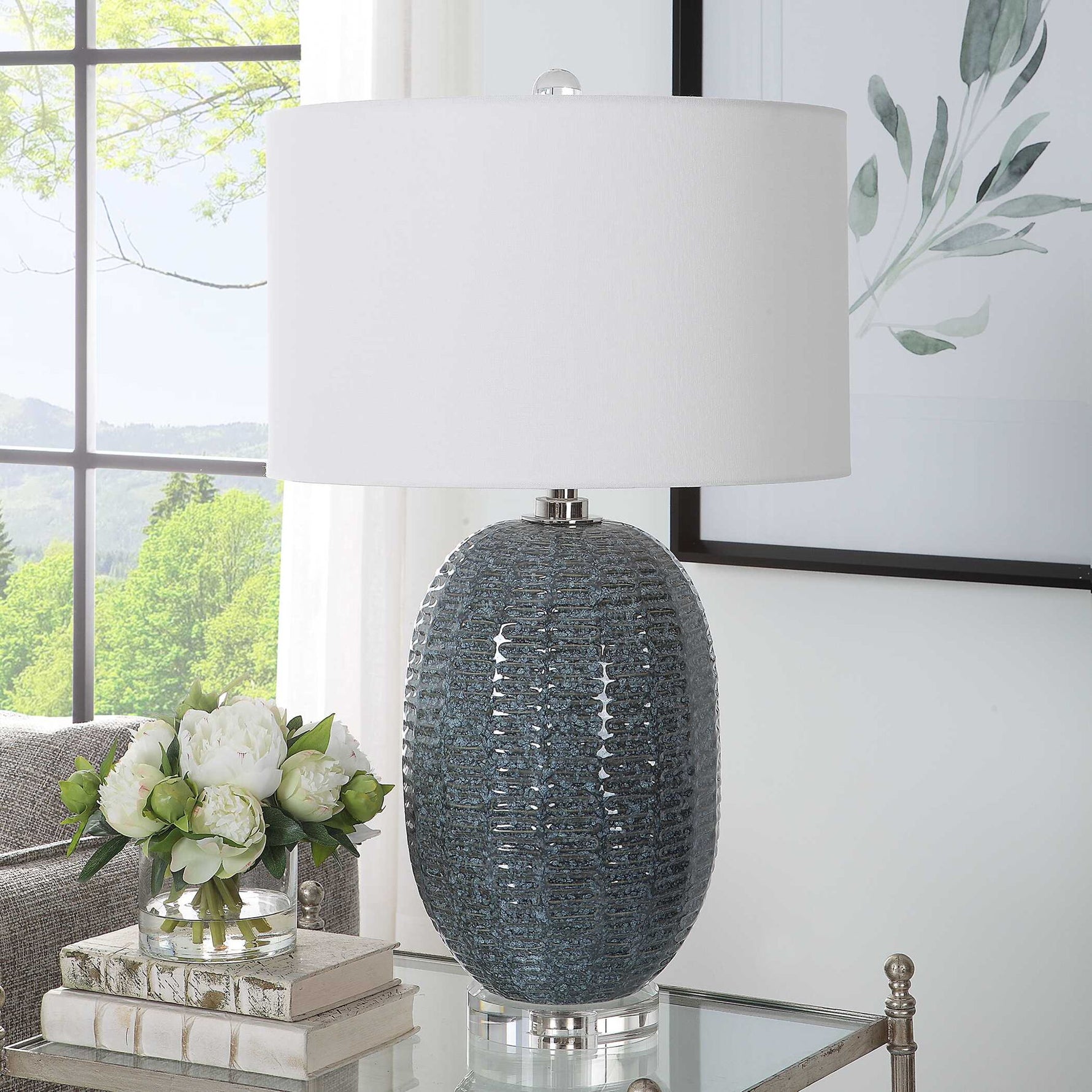 This Ceramic Table Lamp Features A Repeating Geometric Motif Finished In A Mottled Blue-green Glaze, Accented With Polished Nickel Details And A Thick Crystal Foot. The Round Hardback Shade Is A Casual White Linen Fabric.