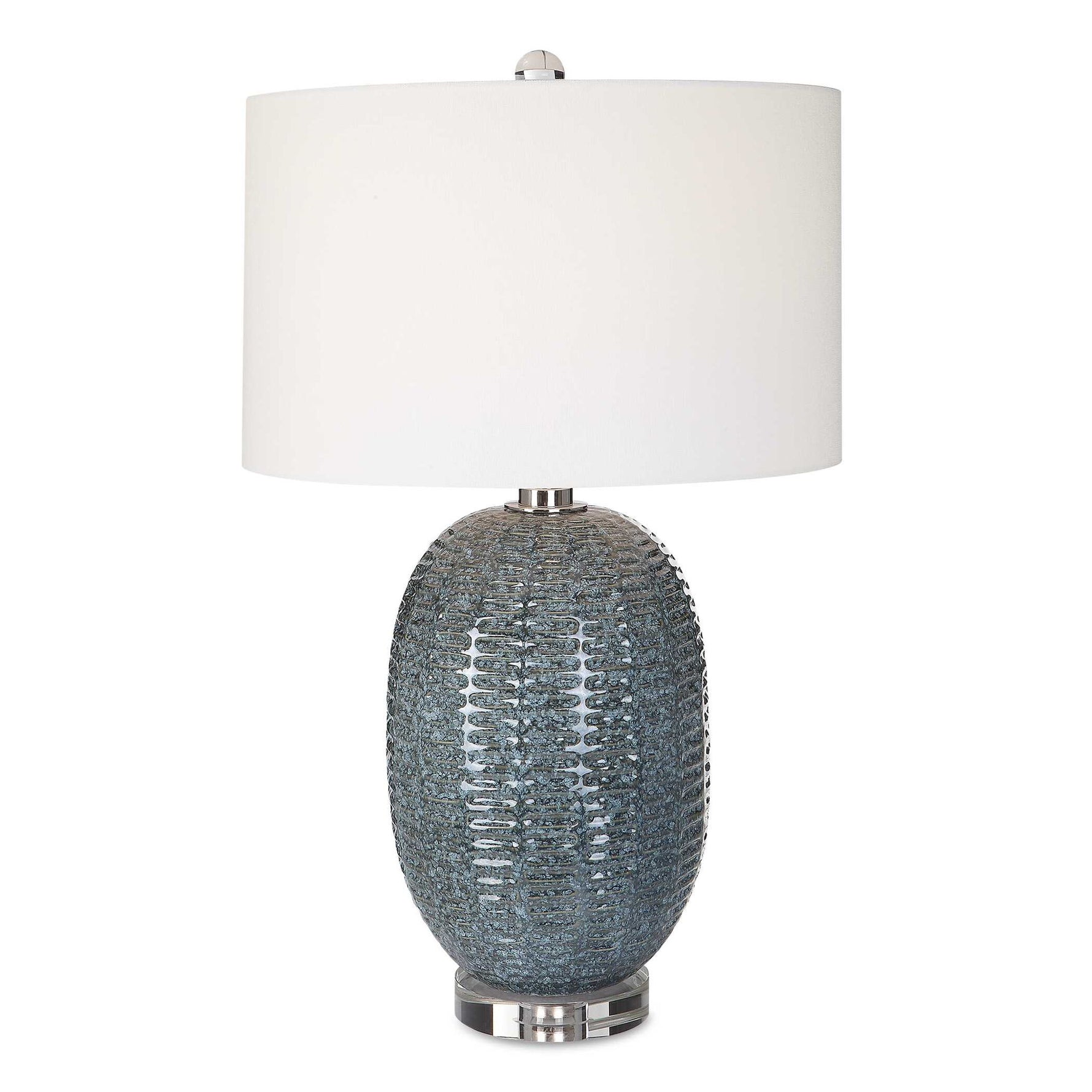 - This Ceramic Table Lamp Features A Repeating Geometric Motif Finished In A Mottled Blue-green Glaze, Accented With Polished Nickel Details And A Thick Crystal Foot.