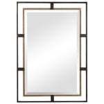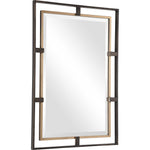 - This Iron Frame Features A 3-dimensional Design With An Outer Overlapping Frame Finished In A Distressed Rustic Bronze, Accented With A Lightly Antiqued Gold Center. This Mirror Is Complemented By A 1" Bevel And May Be Hung Horizontal Or Vertical.