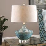 Blue Tie-dyed Ceramic Glaze With Subtle Green Undertones, Paired With Crystal Details And Brushed Nickel Plated Accents. The Slightly Tapered Round Hardback Shade Is A Light Beige Linen Fabric With Natural Slubbing. Due To The Nature Of Fired Glazes On Ceramic Lamps, Finishes Will Vary Slightly.