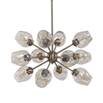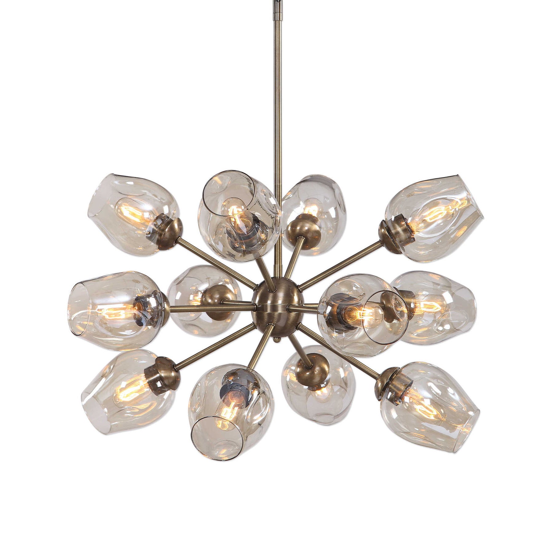 Transitional With A Flair Of Mid-Century Sputnik Style, Our 12 Lt. Rod Hung Chandelier, Features A Warm Antique Brass Finish With Plated Amber Dimpled Glass Shades. 12-60 Watt Max, Edison Sockets. Bulbs Not Included. Supplied With 15' Wire, 3-12" Stems And 1-6" Stem For Adjustable Installation.