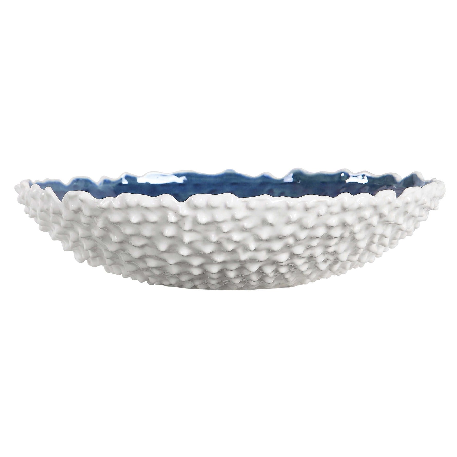 White Ceramic Bowl With Heavy Outer Texture And A Bright Blue Interior Glaze.