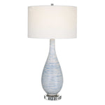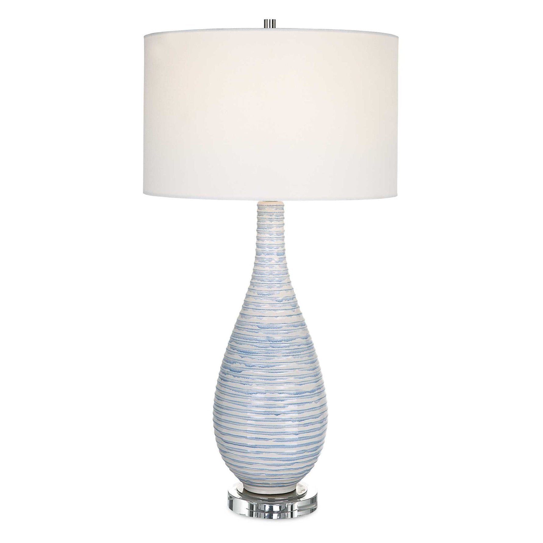 This Ceramic Table Lamp Features An Elegant Fluted Shape With Ribbed Texture Finished In A Soft Blue And White Drip Glaze. The Lamp Sits On A Thick Crystal Foot Paired With Polished Nickel Plated Details. A White Linen Drum Shade Compliments The Piece.
