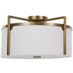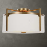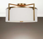Chic And Versatile With Clean Lines This 3 Lt. Semi Flush Mount Features An Antique Brass Finish With Off-white Linen Hard Back Shade With A Central Frosted Glass Diffuser. 3-100 Watt Max, Edison Sockets. Bulbs Not Included.