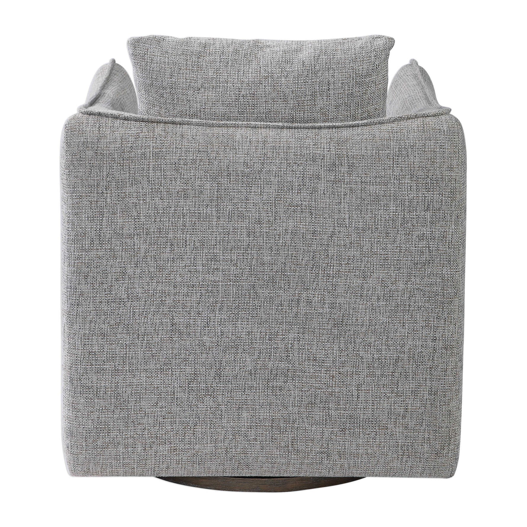 - Casual Shelter Arm Accent Chair Tailored In A Woven Linen Blend Fabric In Natural Stone Hues Of Gray, Tan And Ivory. Features A Flanged Edge Trim Complete With A Loose Back Pillow. Rests On A Solid Birch Wood Swivel Base, Finished In A Weathered Gray Stain.