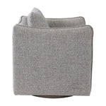 Casual Shelter Arm Accent Chair Tailored In A Woven Linen Blend Fabric In Natural Stone Hues Of Gray, Tan And Ivory. Features A Flanged Edge Trim Complete With A Loose Back Pillow. Rests On A Solid Birch Wood Swivel Base, Finished In A Weathered Gray Stain.