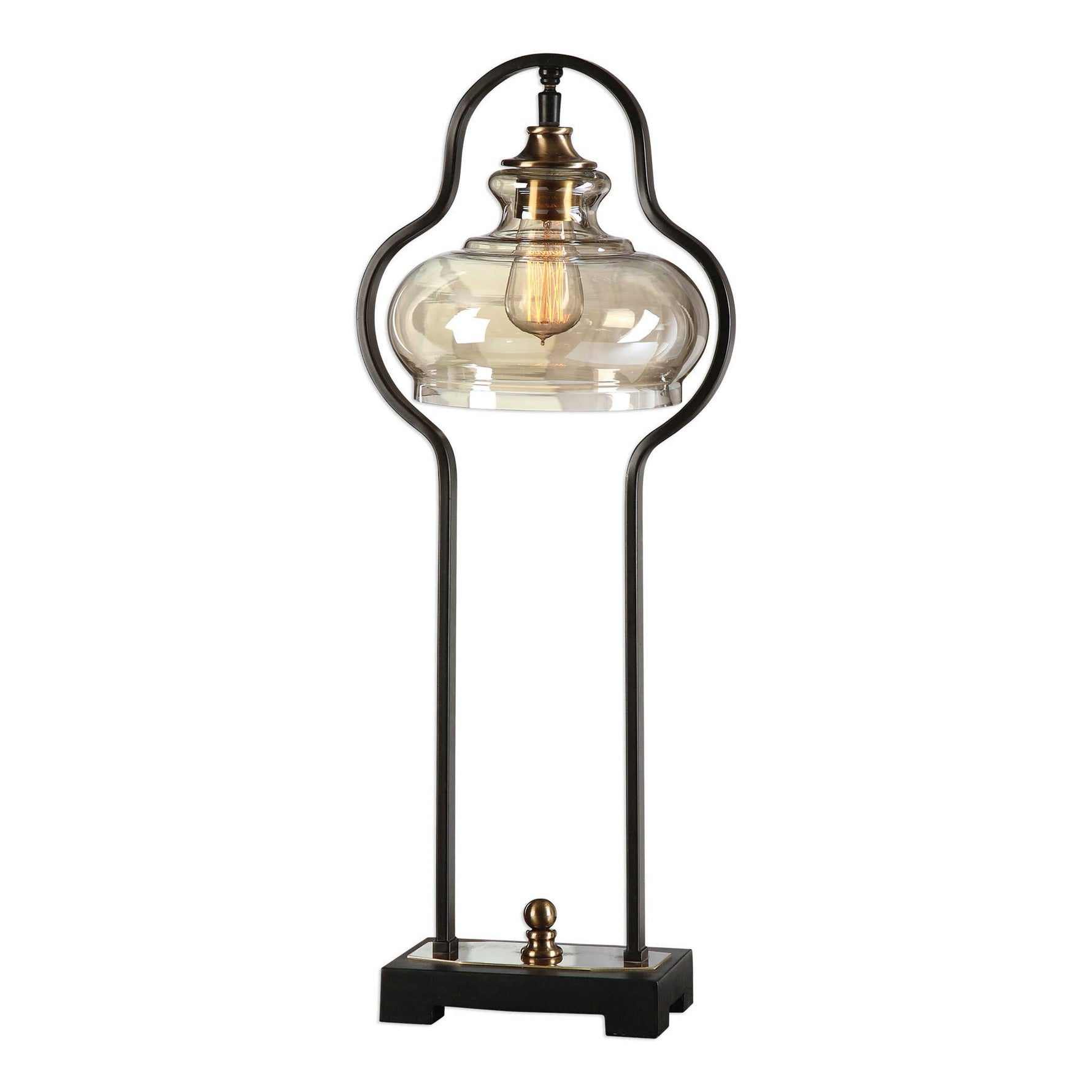 • Curvaceous Forged Iron Finished In An Aged Black, Following The Contour Of The Light Amber Glass Shade, Accented With Brushed Antiqued Brass Plated Details. Pictured With An Antique Style Bulb, Not Included.