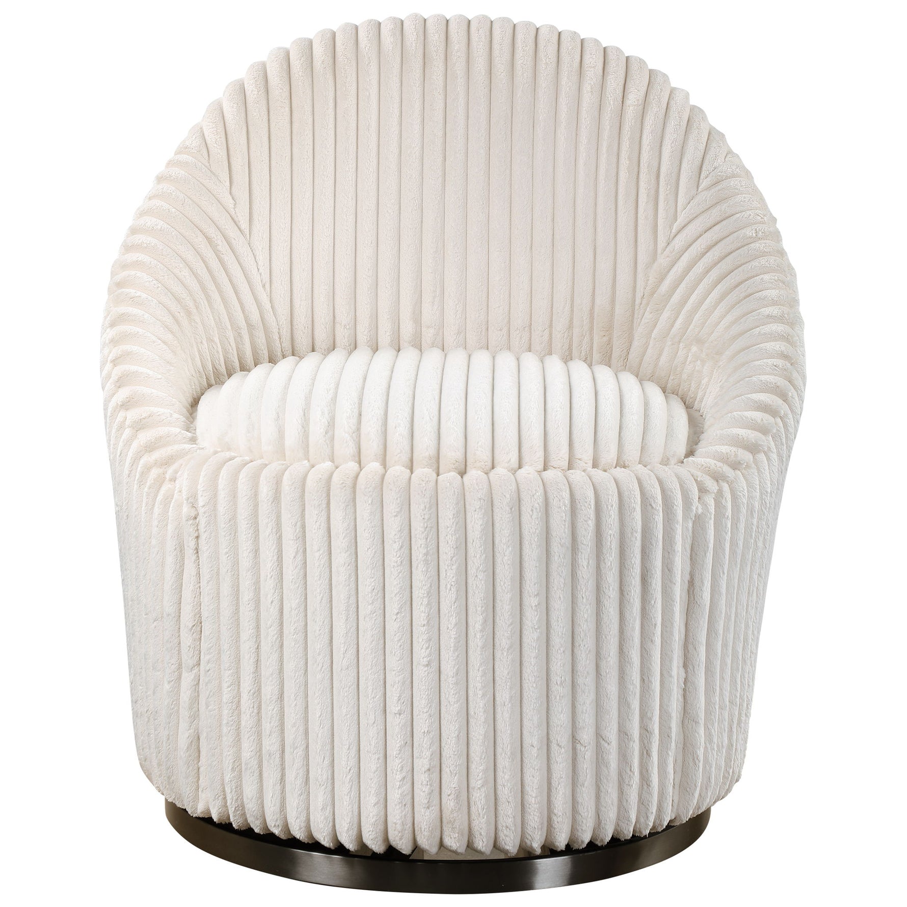 A Blend Of Contemporary And Feminine Styles, This Chair Is Upholstered In A Luxurious Fluted Ivory Chenille Fabric And Is Accented By A Stainless Steel Swivel Base Finished In Brushed Black Nickel.