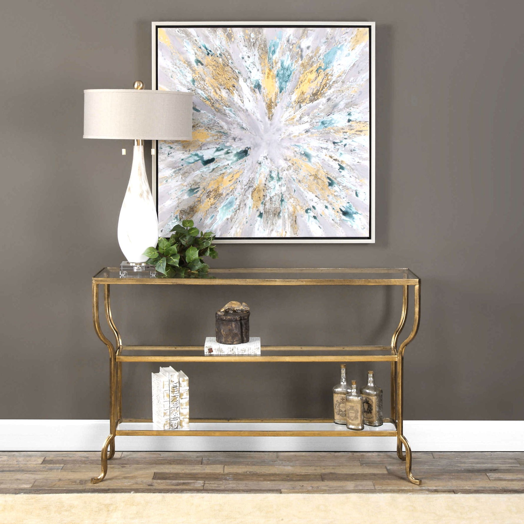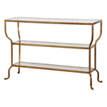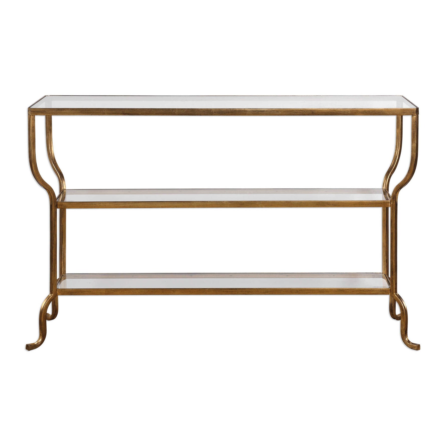 - Elegantly Curved Frame Accentuates The Graduated Top Of This Console In Hand Forged Iron With An Antiqued Gold Finish. Shelves Are Clear Tempered Glass.