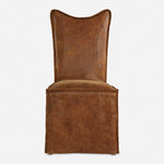 Thick Top Grain Nubuck Leather Slipcover Chair In A Distressed Hand-sanded Cognac With A Tailored Double Stitched Design And Casual Flange Edges, Featuring A Button Closure Back. Because Leather Is A Natural Product, Both Texture And Color Will Vary Slightly From Hide To Hide And Within The Same Hide. Slipcovers Packaged Separately. Sold As A Set Of 2. Seat Height Is 19".