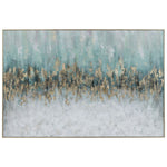 Make A Statement With This Bold Hand Painted Artwork. Deep Teal And Aqua Tones Are Accented By Subtle Blush Highlights And Are Met By White And Light Gray Brushstrokes, All Separated By Gold Leaf Accents, And Completed With A Gold Leaf Gallery Frame. Due To The Handcrafted Nature Of This Artwork, Each Piece May Have Subtle Differences.