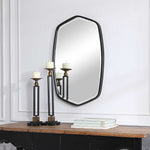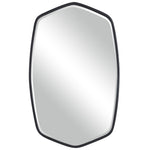 - This Hand Forged Iron Mirror Frame Features A Unique Shape With Elegant Curves, Finished In A Streamlined Satin Black. Mirror Has A Generous 1 1/4" Bevel.