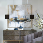 Minimal Yet Striking, This Hand Painted Artwork Displays A Neutral Color Palette With Strong Navy, Blue, And Gold Tones And Unique Textures And Distressing. The Piece Is Accented By A Gold Leaf Finished Gallery Frame.