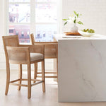 High Supportive Back And Curvy Flair Arms Make A Grand Style Statement In A Lightly Glazed And Bleached Sandstone Exposed Hardwood Finish With Cane Sides, Tailored In A Durable Yet Lush Off-white Fabric With Added Performance Treatment To Resist Soiling And Stains. Polished Nickel Metal Kick Plate.