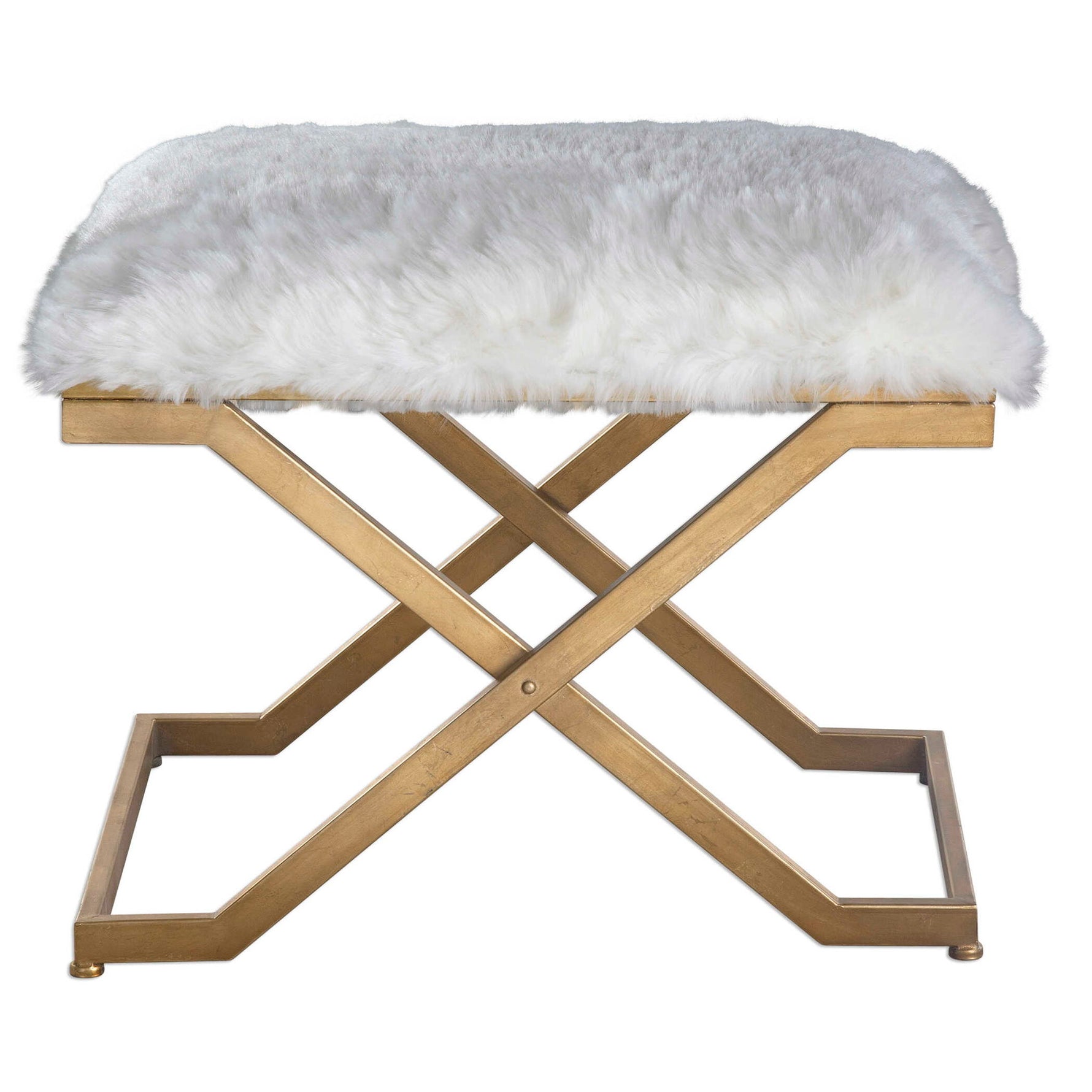 - Plush Faux Fur In Soft White Atop Legs Of Thick Industrial Hand Forged Iron Finished In Antiqued Gold Leaf.