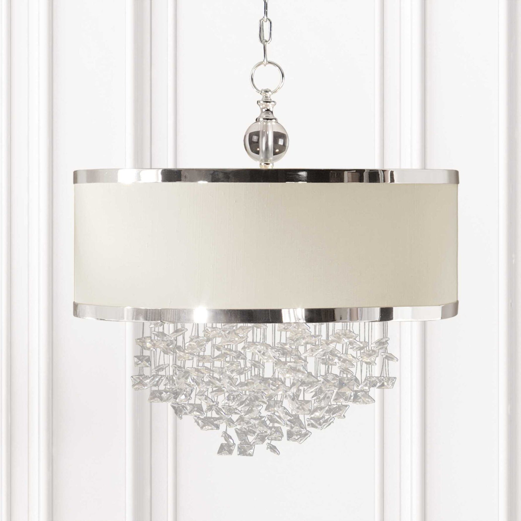 The Classic Appeal Of Crystal Is Updated For Today's Sophisticated Tastes, With Free-falling Crystals And A Silver-trimmed, Antique White Linen Drum Shade. 3-100 Watt Max, Edison Sockets. Bulbs Not Included. Supplied With 15' Wire And 7' Chain For Adjustable Installation.