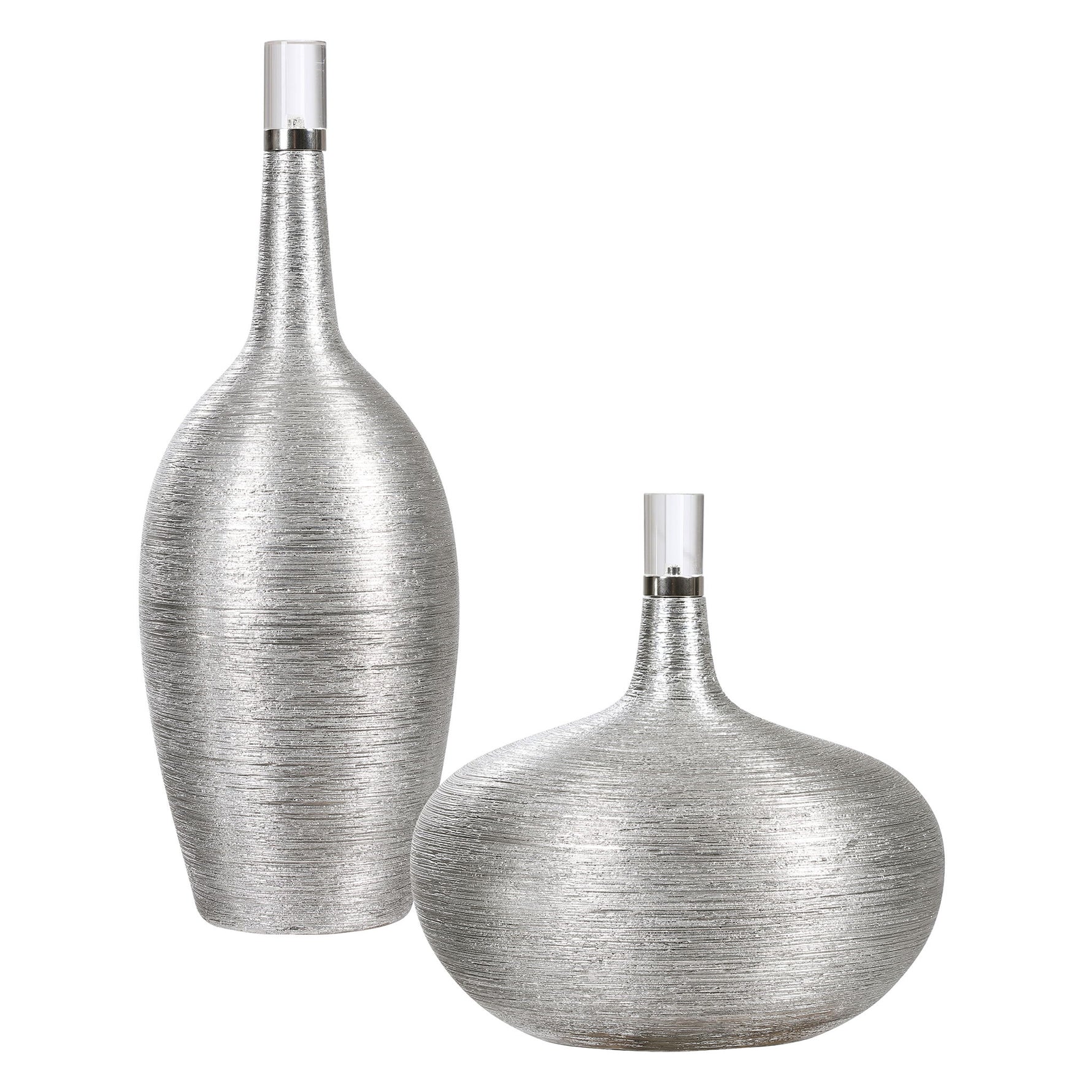 Set Of Two Ceramic Bottles Showcase A Subtle Ribbed Texture, Finished In Bright Silver Leaf With Crystal And Brushed Nickel Accents. Sizes: S-10x11x10, L-6x17x6