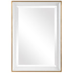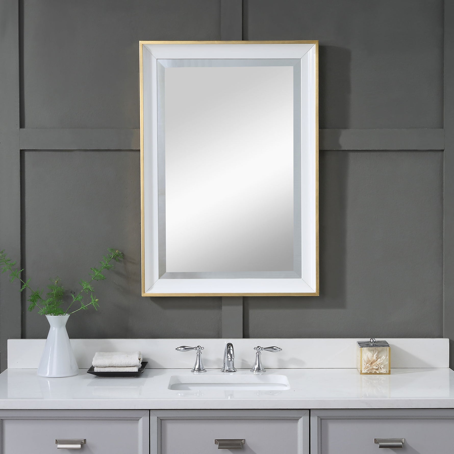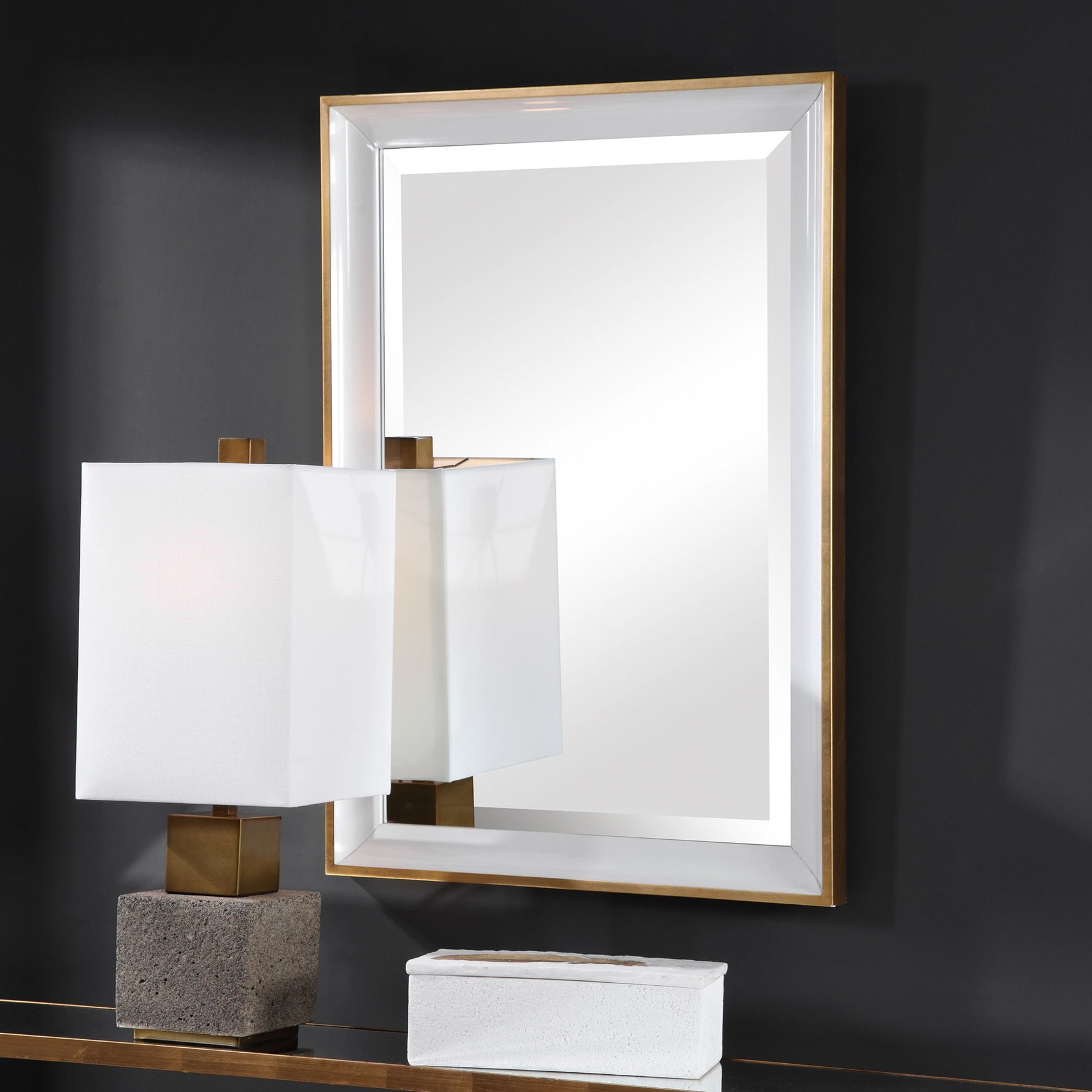 This Elegantly Refined Design Has A Large Gloss White Inner Frame Accented By A Petite Gold Leaf Outer Frame. The Mirror Has A 1" Bevel And May Be Hung Horizontal Or Vertical.
