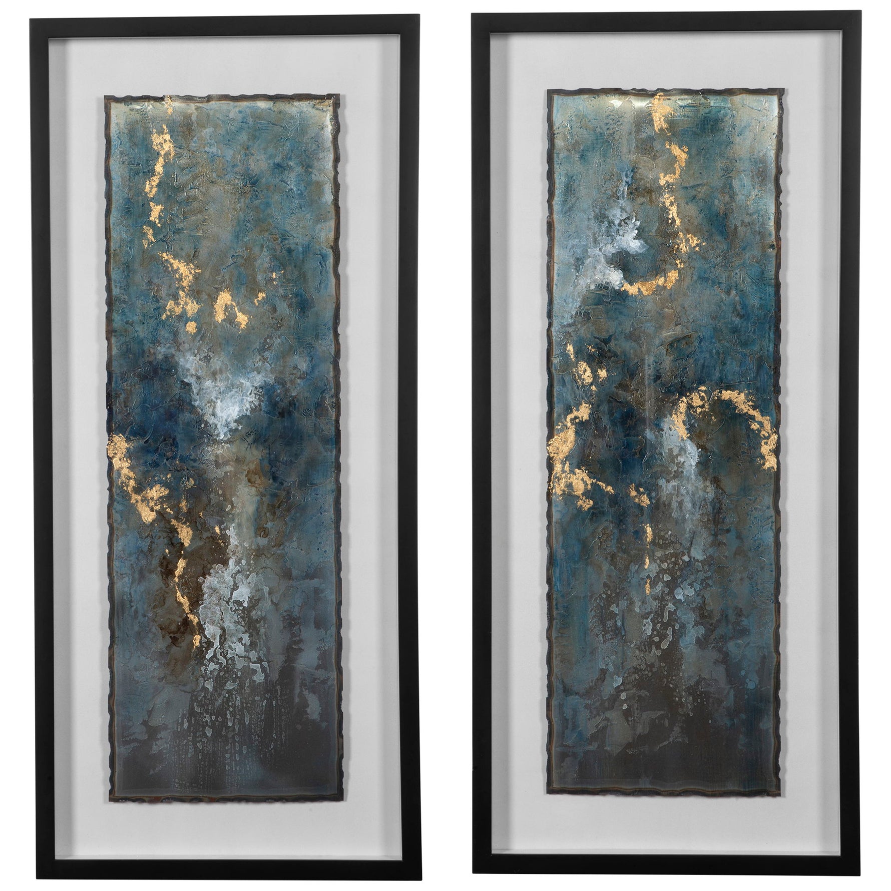 Inspired By Natural Gemstones, These Metal Sheets Are Hand Painted In Blue, Turquoise, White And Gold Leaf. The Raw Metal Edge Is Softened By Oatmeal Linen Backing And A Black Shadow Box Style Frame Under Glass. Due To The Handcrafted Nature Of This Artwork, Each Piece May Have Subtle Differences.