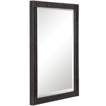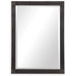 Crafted From Hand Forged Iron, This Rectangular Mirror Features Raised Geometric Detailing Finished In A Rustic Aged Black With Subtle Silver Highlights And A Gray Patina Wash. The Mirror Is Surrounded By A Generous 1 1/4" Bevel And May Be Hung Horizontal Or Vertical.