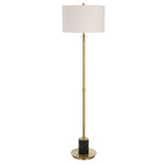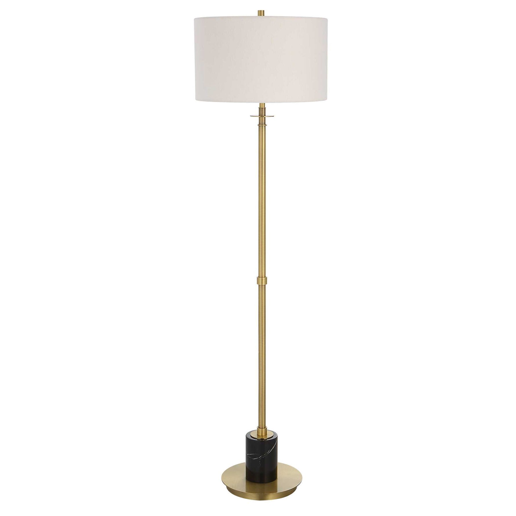 This Sophisticated Design Showcases A Sleek Iron Base Finished In A Lightly Antiqued Plated Brass, Accented By A Substantial Black Marble Column Above The Foot. The Round Hardback Shade Is Covered In A White Linen Fabric.