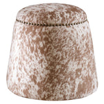 - This Plush Ottoman Is Covered In A Soft Chestnut And White Faux Cow Hide With Antique Brass Nail Head Details. Versatile And Stylish, This Piece Can Be Used As A Seat Or Footrest, Grouped Together Or As A Singular Accent Piece.