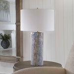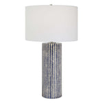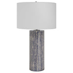This Ceramic Table Lamp Features Eye-catching, Crudely Carved, Cobalt Glazed Stripes With Contrasting Ivory, Accented With Brushed Nickel Details. The Round Hardback Shade Is Covered In A White Fabric.